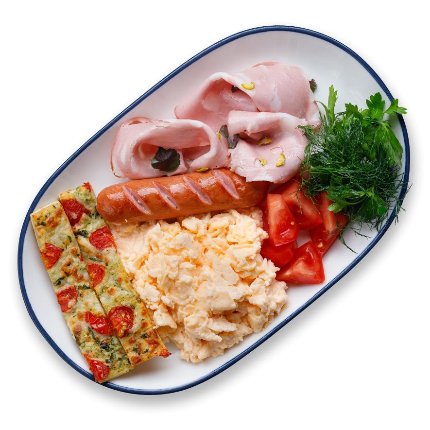 куриное яйцо, томаты, зелень, мортаделла, сосиска с сыром, заправка «бора-бора», фокачча с томатами, пармезан, фисташка, оливковое масло