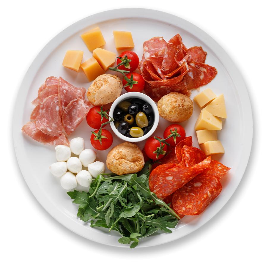 сальчичон, чоризо с паприкой, чоризо, сырные булочки, маслины, оливки, гауда, пармезан, мини-моцарелла, томаты черри, рукола