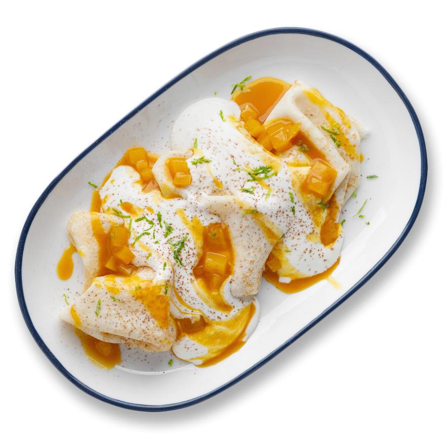 блины, крем «Тирамису», соус «Манго-маракуйя», цедра лайма, какао