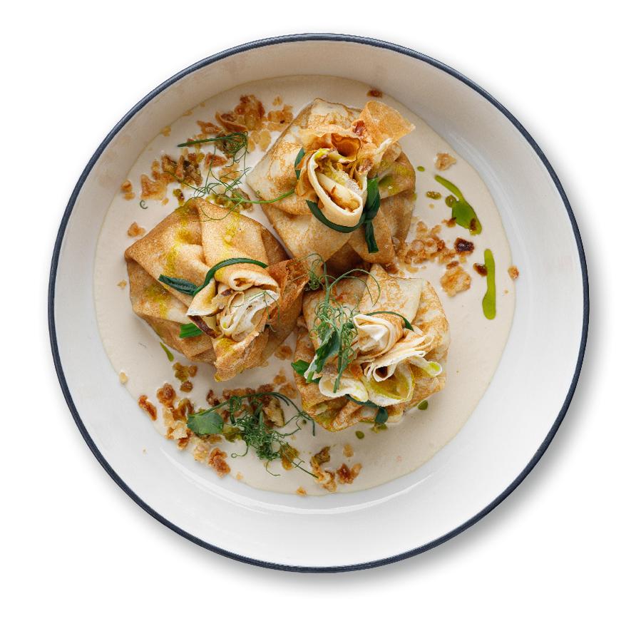 блинчики, куриное бедро, вёшенки, шампиньоны, Моцарелла, майонез, репчатый и зелёный лук, сливочный соус, зелёное масло, микрозелень, лук фри