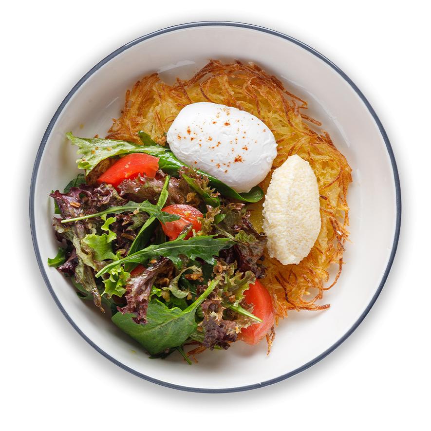 картофель, белая икра, микс салата, томаты черри, заправка «Бора-бора», куриное яйцо, луковые чипсы