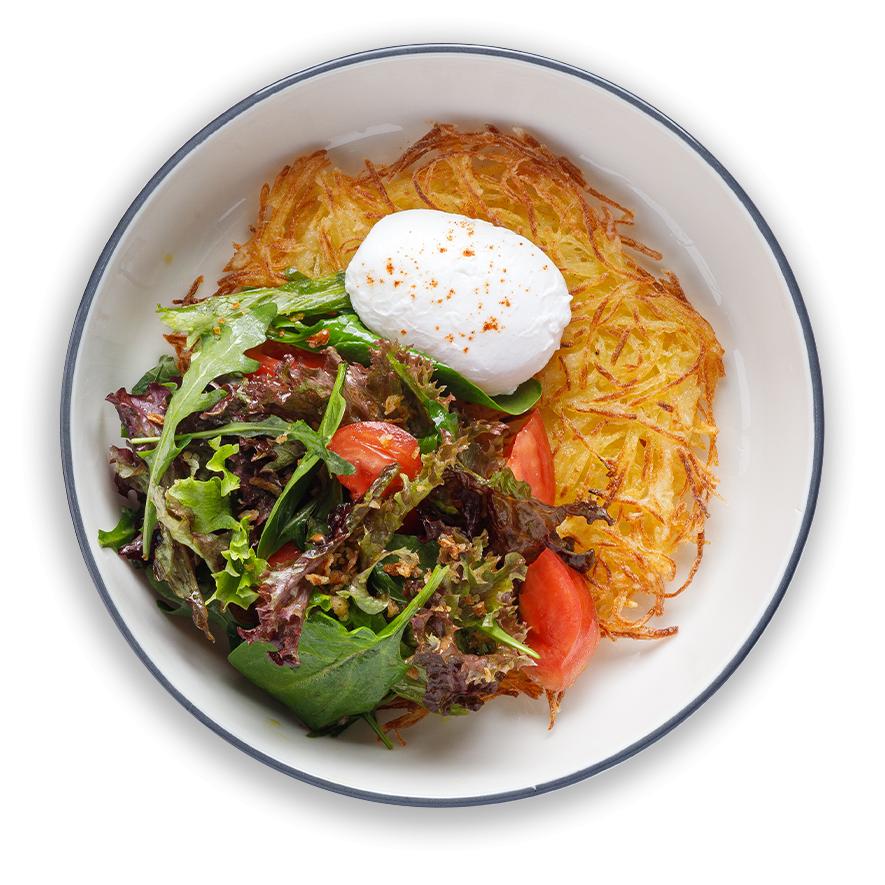 картофель, микс салата, томаты черри, заправка «Бора-бора», куриное яйцо, луковые чипсы