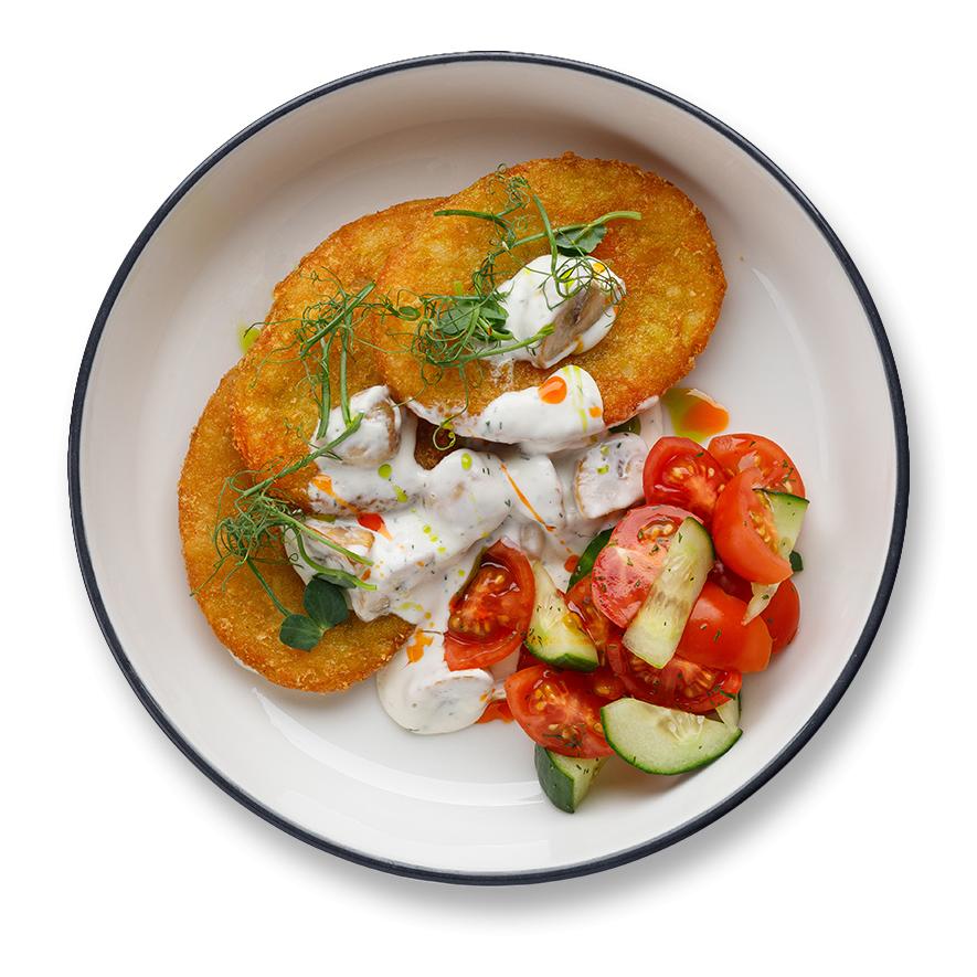 картофель, шампиньоны, томаты черри ,огурец, растительные сливки, укроп, лук фри, микрозелень, зелёное масло