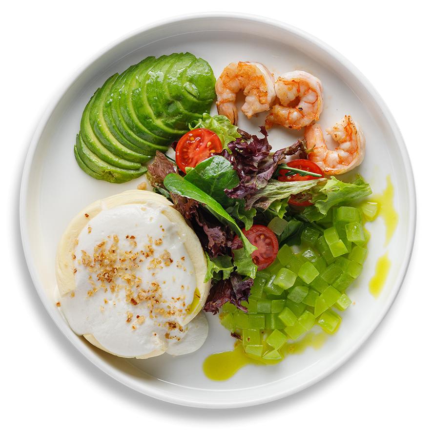 креветки, авокадо, куриное яйцо, сливочное масло, микс салата, томаты черри, луковые чипсы, соус «Пармезан», огурцы «Песто», зелёное масло