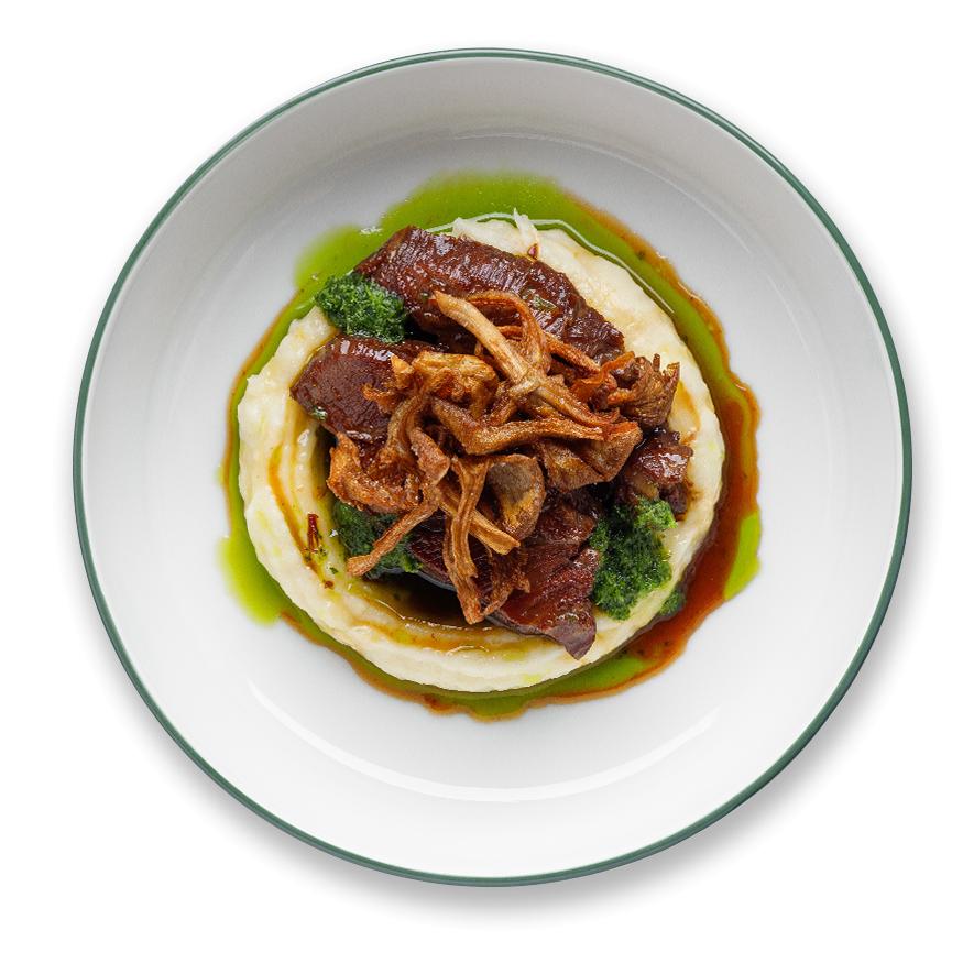 говяжьи щёчки, картофельное пюре, соус «демиглас», соевый соус, вёшенки, зелёное масло, кунжут «кимчи»