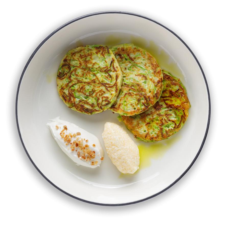 кабачки, белая икра, куриное яйцо, зелёное масло