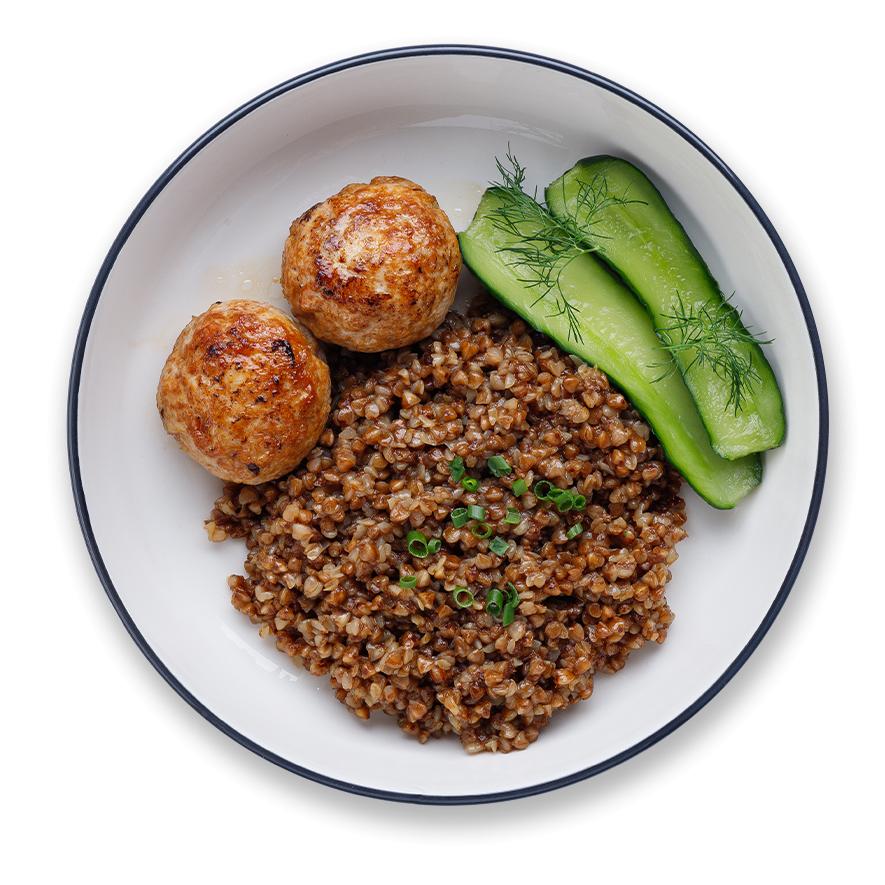 гречка, индейка, сливочное масло, соус «демиглас», зелень, зелёный лук, малосольный огурец