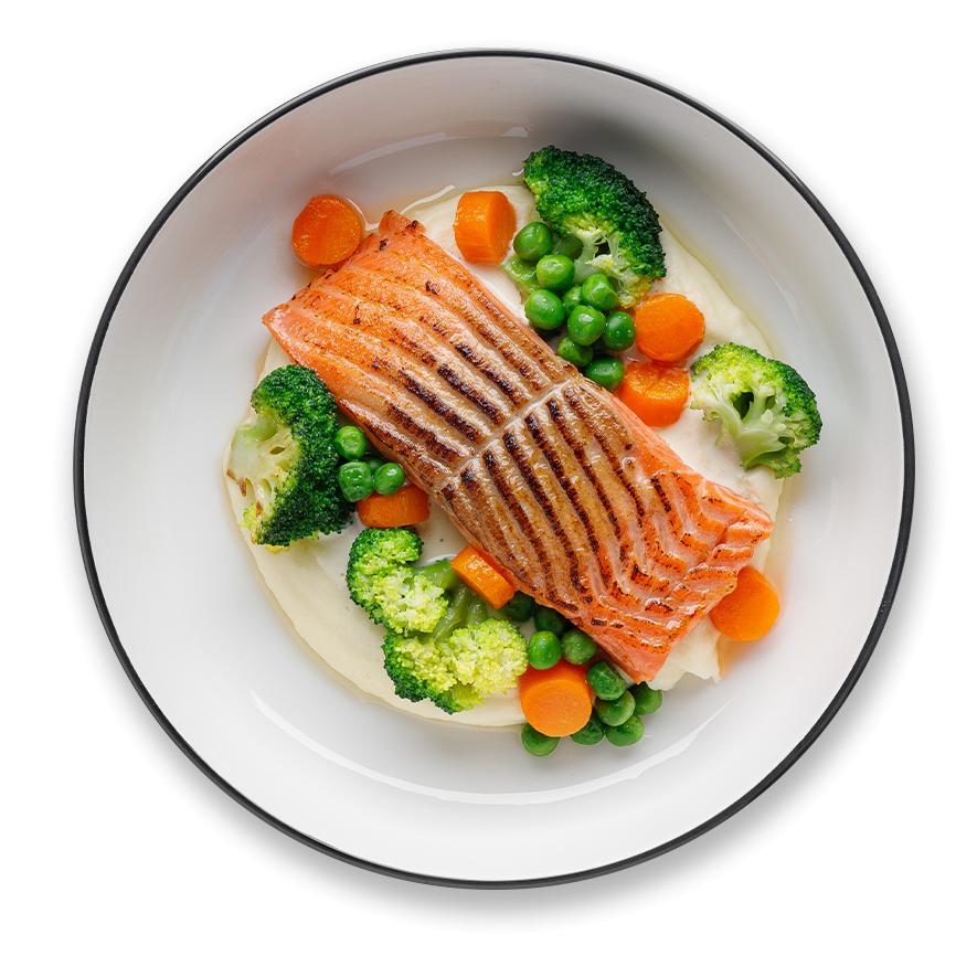 лосось, сливочный соус, мидии, картофельное пюре, морковь, брокколи, зелёный горошек, зелёное масло