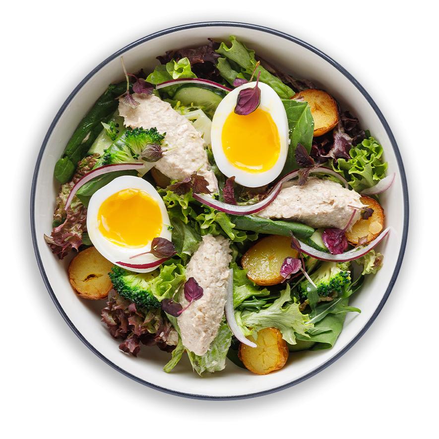 риет из тунца, огурец, брокколи, картофель бейби, микс салата, красный лук, куриное яйцо, заправка «бора-бора», микрозелень