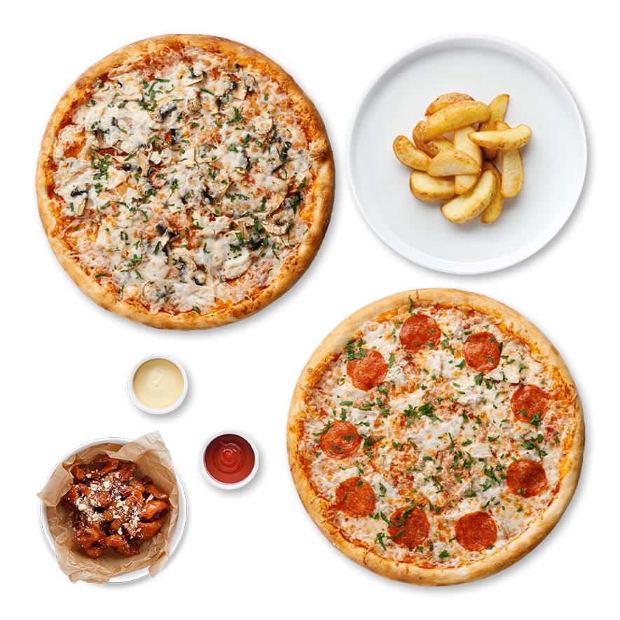 стандартная пицца «мясная», стандартная пицца курица, ветчина, шампиньоны, куриные чипсы, 2 порции картофельных долек, соус барбекю, соус сырный