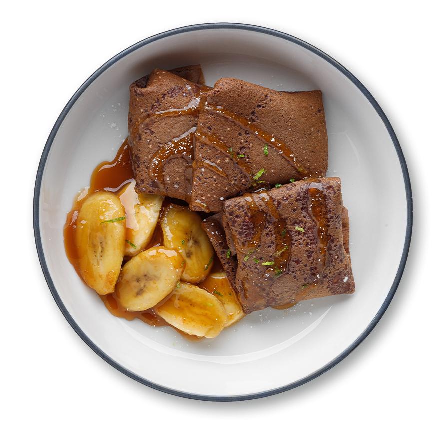 шоколадные блины, банан, сливочный крем, карамельный соус, цедра лайма, сахарная пудра