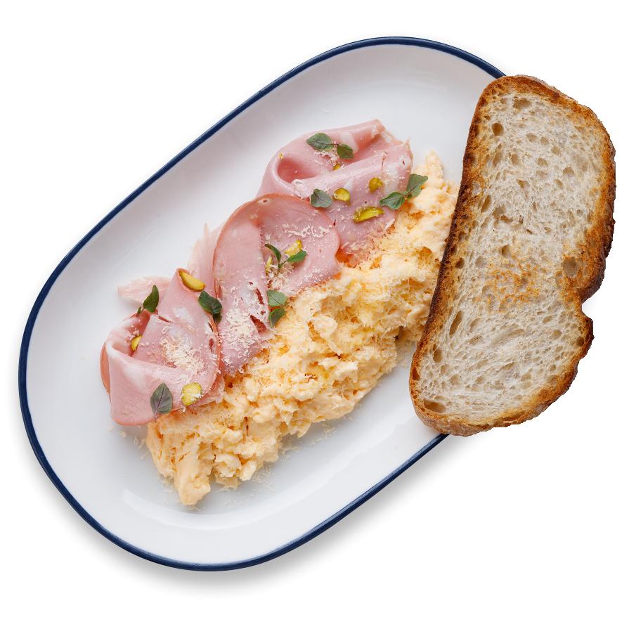 мортаделла, хлеб «тартин», молоко, куриное яйцо, трюфельное масло, пармезан, творожный сыр, фисташка, микрозелень