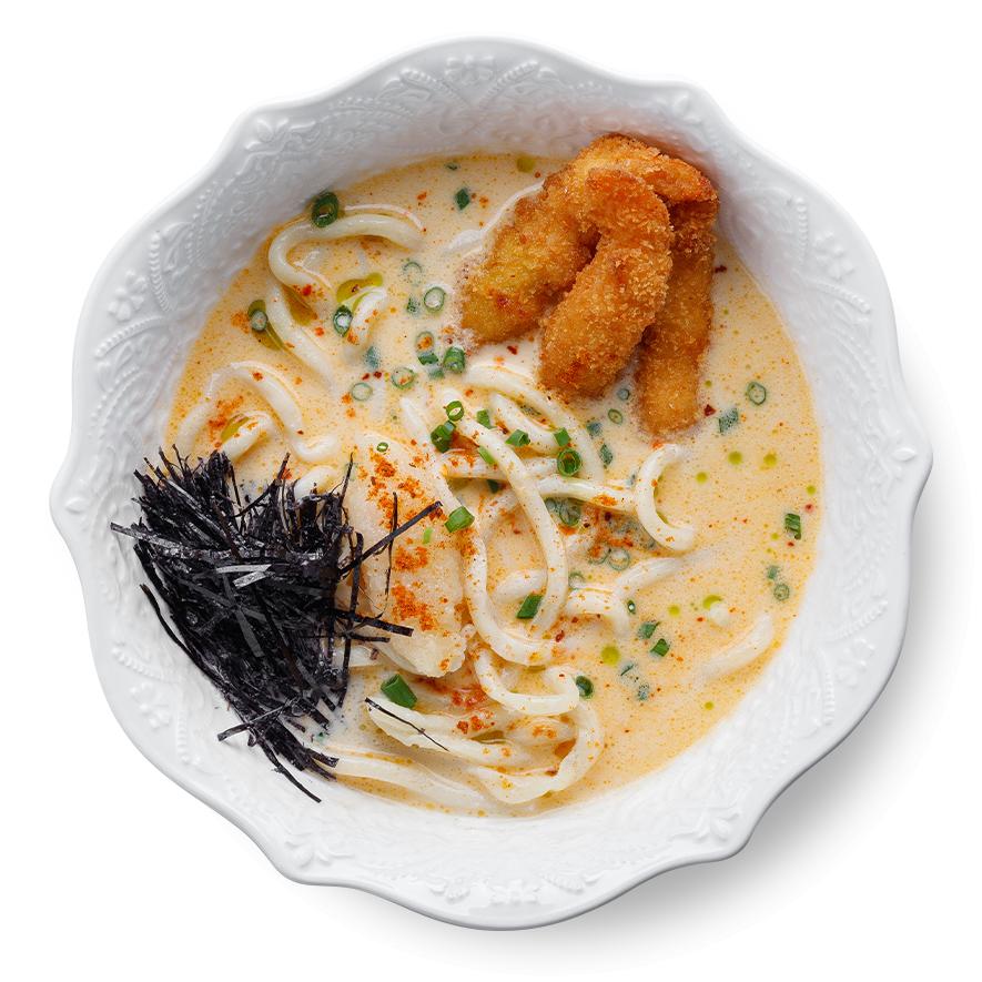 лапша лагман, креветки, куриный бульон, сливки, кокосовое молоко, паста «том ям», паста «том кха», зелёное масло, зелёный лук, нори, икра сельди, кунжут, тогораши