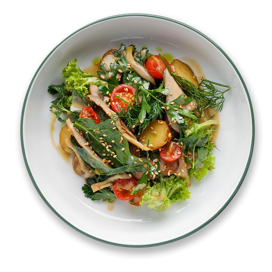 индейка, мини-картофель, вёшенки, микс салата, медово-горчичный соус, запечёные черри, соус «демиглас», кунжут «кимчи»